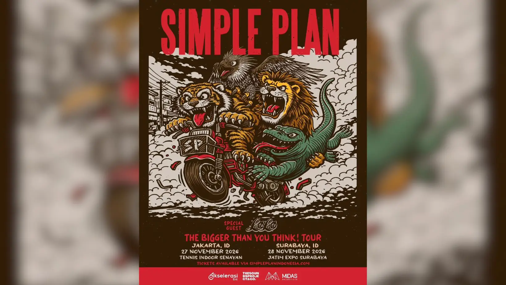 Dalam tur bertajuk “The Bigger Than You Think! Tour”, Simple Plan akan tampil di dua kota sekaligus, yakni Jakarta dan Surabaya. Kabar ini diumumkan oleh promotor lokal, Akselerasi Entertainment, melalui akun Instagram resmi mereka.