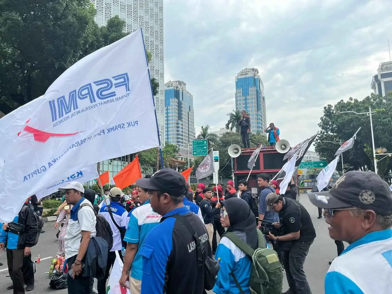 Aksi Demo Buruh Tolak UMP 2026 di Kawasan Patung Kuda Monas, Jakarta