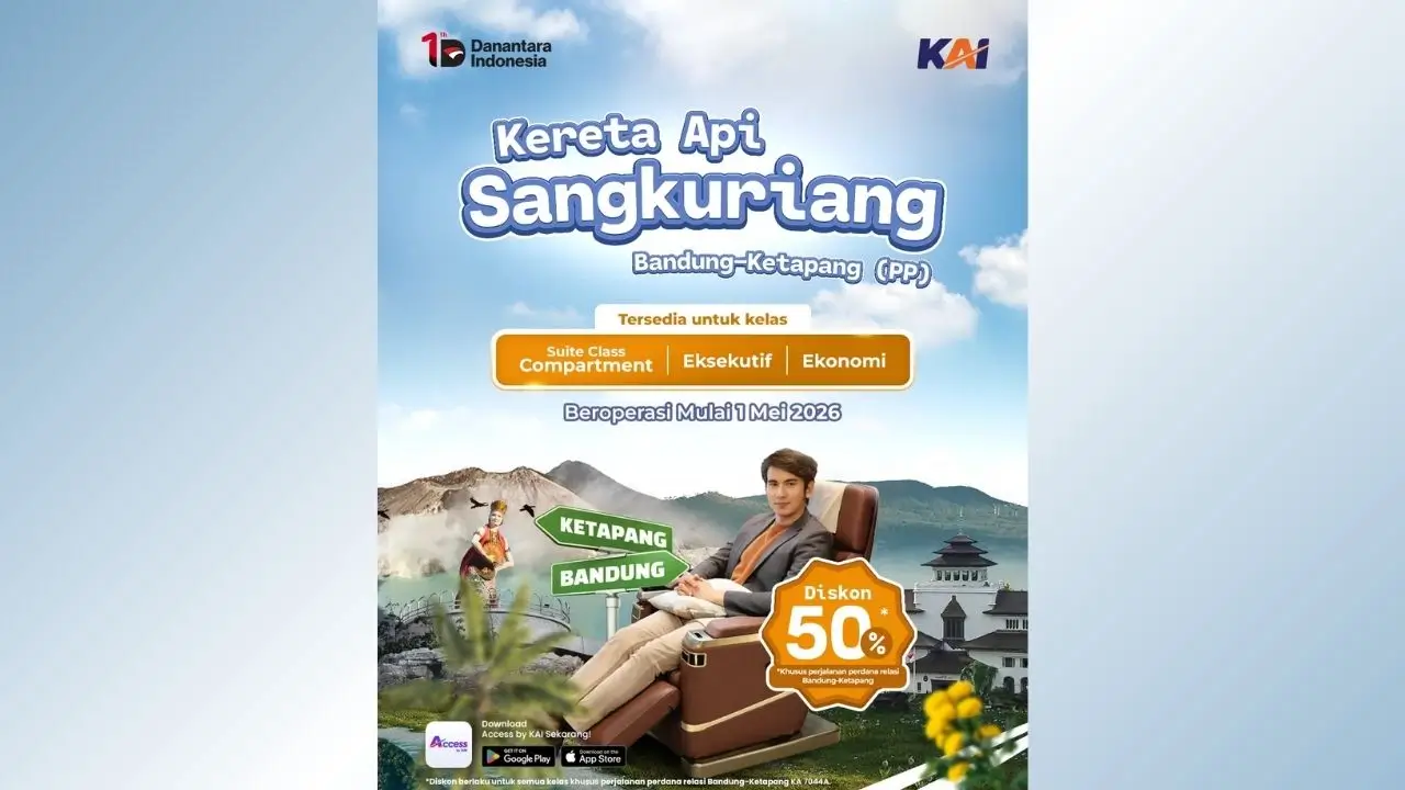 ThePhrase.id – PT Kereta Api Indonesia (KAI) resmi meluncurkan KA Sangkuriang yang melayani rute Bandung–Banyuwangi. Perjalanan perdana kereta ini dijadwalkan berlangsung pada 1 Mei 2026, sekaligus menjadi momen spesial dengan adanya potongan harga tiket hingga 50 persen bagi pelanggan.