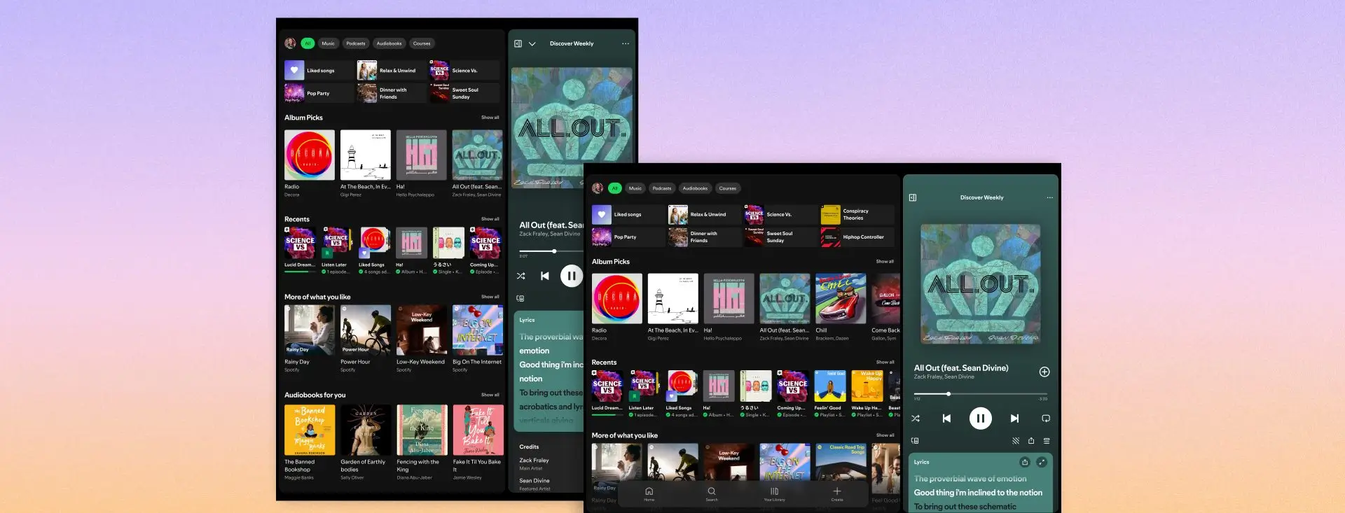 Spotify juga menambahkan sidebar yang dapat dilipat, sehingga pengguna dapat menjelajah rekomendasi, library, atau playlist tanpa mengganggu pemutaran konten. Fitur parallel browsing turut dihadirkan untuk memungkinkan aktivitas multitasking, di mana pengguna dapat memutar musik atau video di satu sisi layar sambil menelusuri konten lain di sisi berbeda.